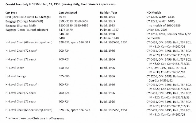 From my El Capitan clinic slides of 2009, here are the cars that were added to the consist for the time period of July 1956 through Jan. 1958: